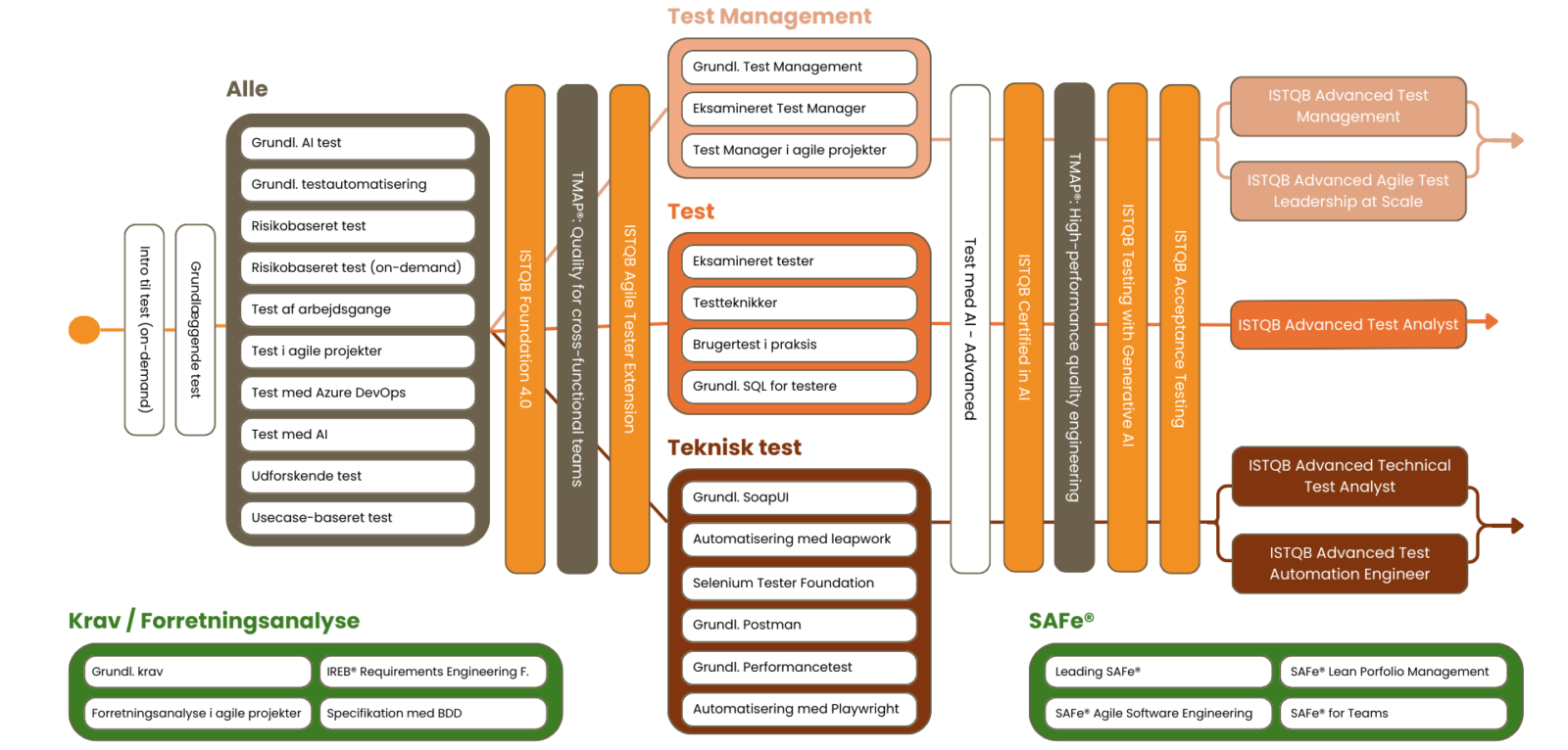 Vi har en lang række nye kurser på vej, som du kan finde i nedenstående karrierevej. Disse handler om at du kan dykke ned i din faglighed som forretningsanalytiker, Product Owner, Business Analyst eller projektleder. Det kan være alt fra specificering af krav, kravstyring, Brugertest i praksis, modellering bare for at nævne nogle få. Tag fat i os for yderligere dialog.